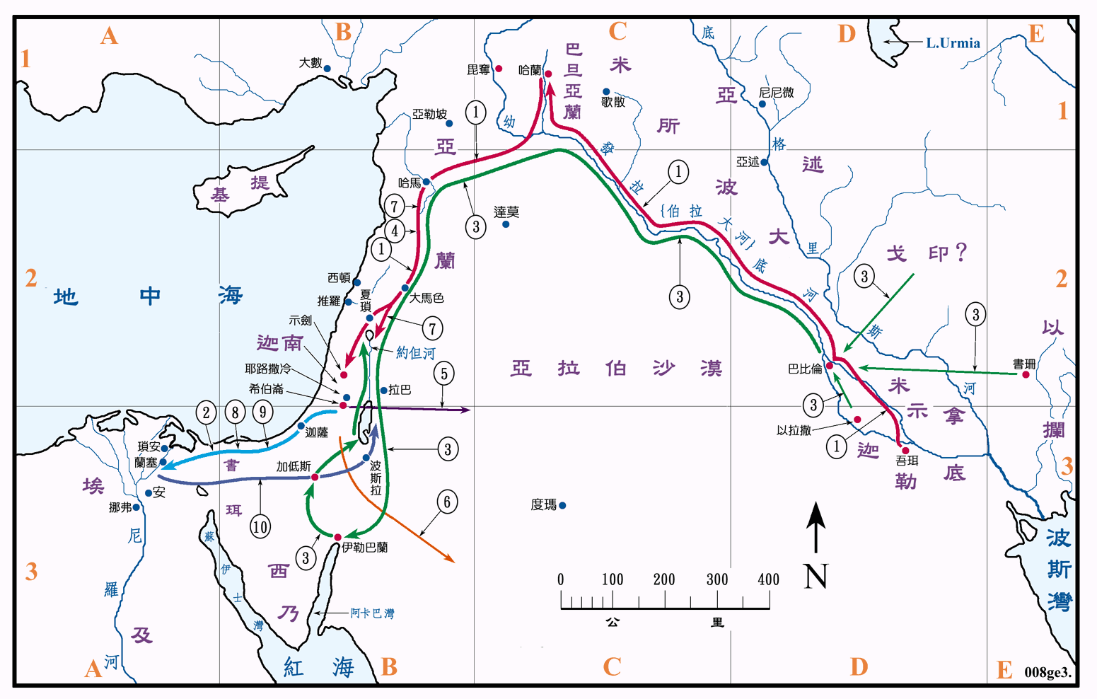 本图将创世记内族长们在迦南地以外活动的地点绘出,主要有迦勒底、哈兰和埃及。吾珥是一个早在 5000BC 以前就已存在的文明古城,也是示拿地的政治、文化、宗教和贸易的中心,其文化水平在其它各地之上,当亚伯兰离开之时,约是 2100BC,正是吾珥王朝和苏美文化最鼎盛的时期,所以要离开这种最繁荣之地,而去落后地区,的确是一个很大的牺牲,也要有极为大的信心和勇气。