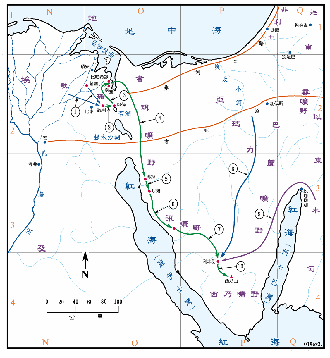 出埃及的路线有几种不同的说法,传统上认为是沿红海的东岸南下,到西乃半岛南端的西乃山,然后再转向北行到加低斯。所以主要的活动地区是在西乃半岛。