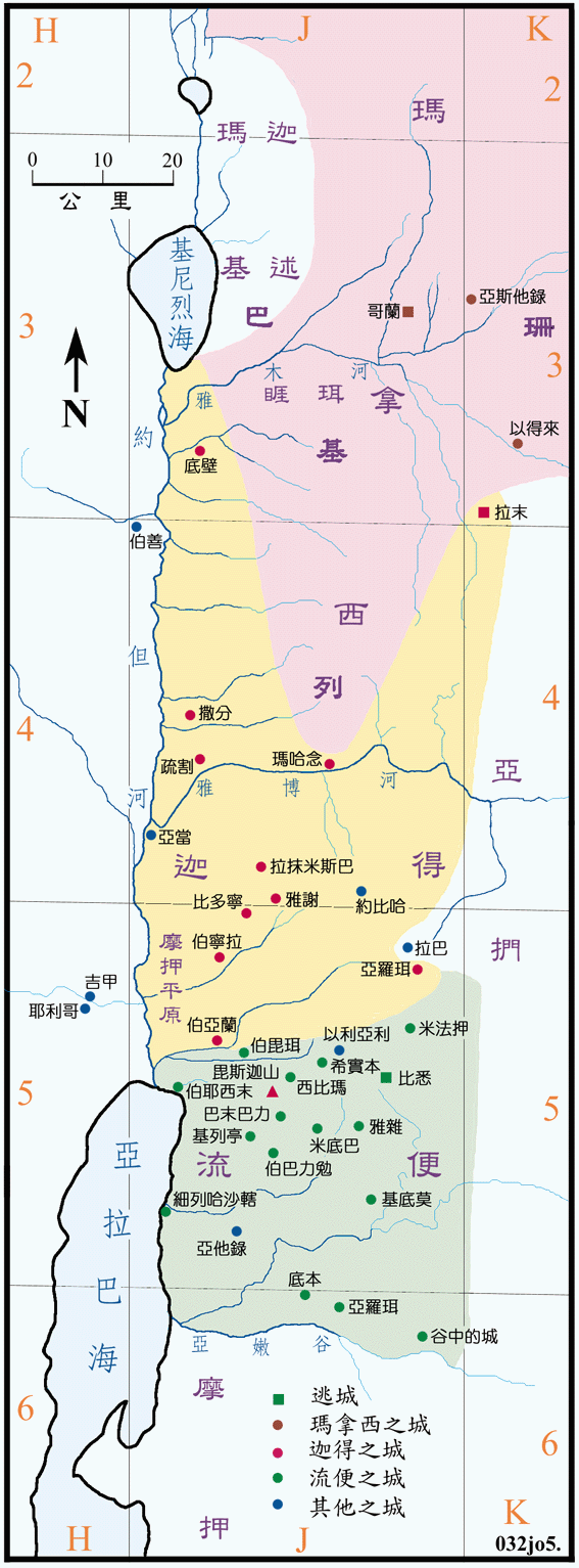在民数记第卅二章中,摩西已分了地给两个半支派,但三者之间似乎没有明确的疆界,而且迦得和流便两个支派的城互相混杂,但在本节中,则将原属于迦得支派的底本、亚罗珥和亚他录,改属流便支派所有。这样一来,流便和迦得两支派的领土就十分完整,边界也清楚。迦得拥有雅博河以北的约但河谷,又有基列山东边的拉末城,但玛拿西确分得基列的一半,所以两侧都是迦得的地,看起来很奇怪。