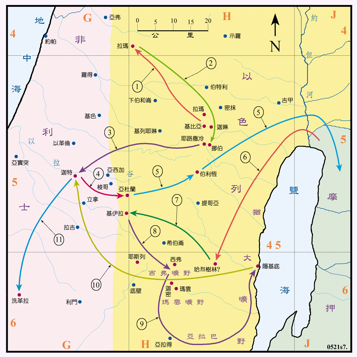 9.撒上 23:24-24:7 大卫逃避扫罗的追杀,从西弗旷野、经亚拉巴、玛云的旷野,到了隐基底的山寨。扫罗追至隐基底的旷野中的山洞大解时,大卫只割下扫罗的衣襟而未杀他。