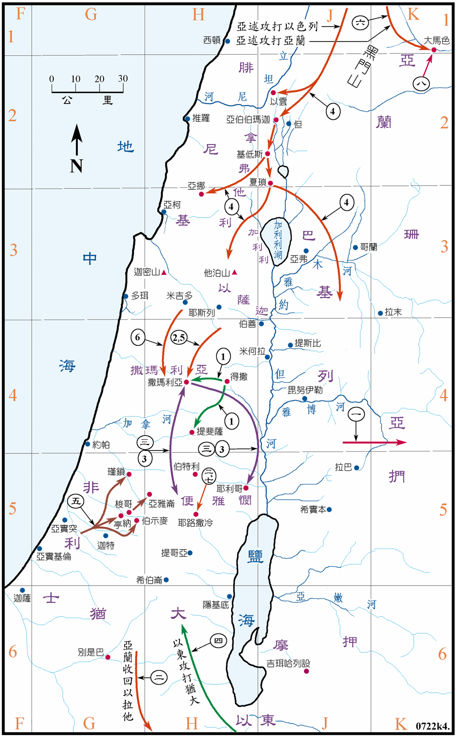 五、代下 28:18 非利士人也来侵占高原和犹大南方的城邑,攻取了伯示麦、亚雅仑、基低罗、梭哥、亭纳和瑾锁等城。