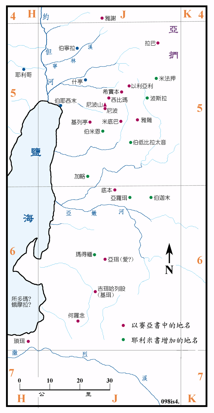 摩押自被亚摩利王西宏所败之后,即退到亚嫩河以南之地,此时再度兴起,领土已扩展到了雅谢以北,占了迦得大部份之土地。在耶利米书中,又多了几个地名,特用绿色圆点表示之。