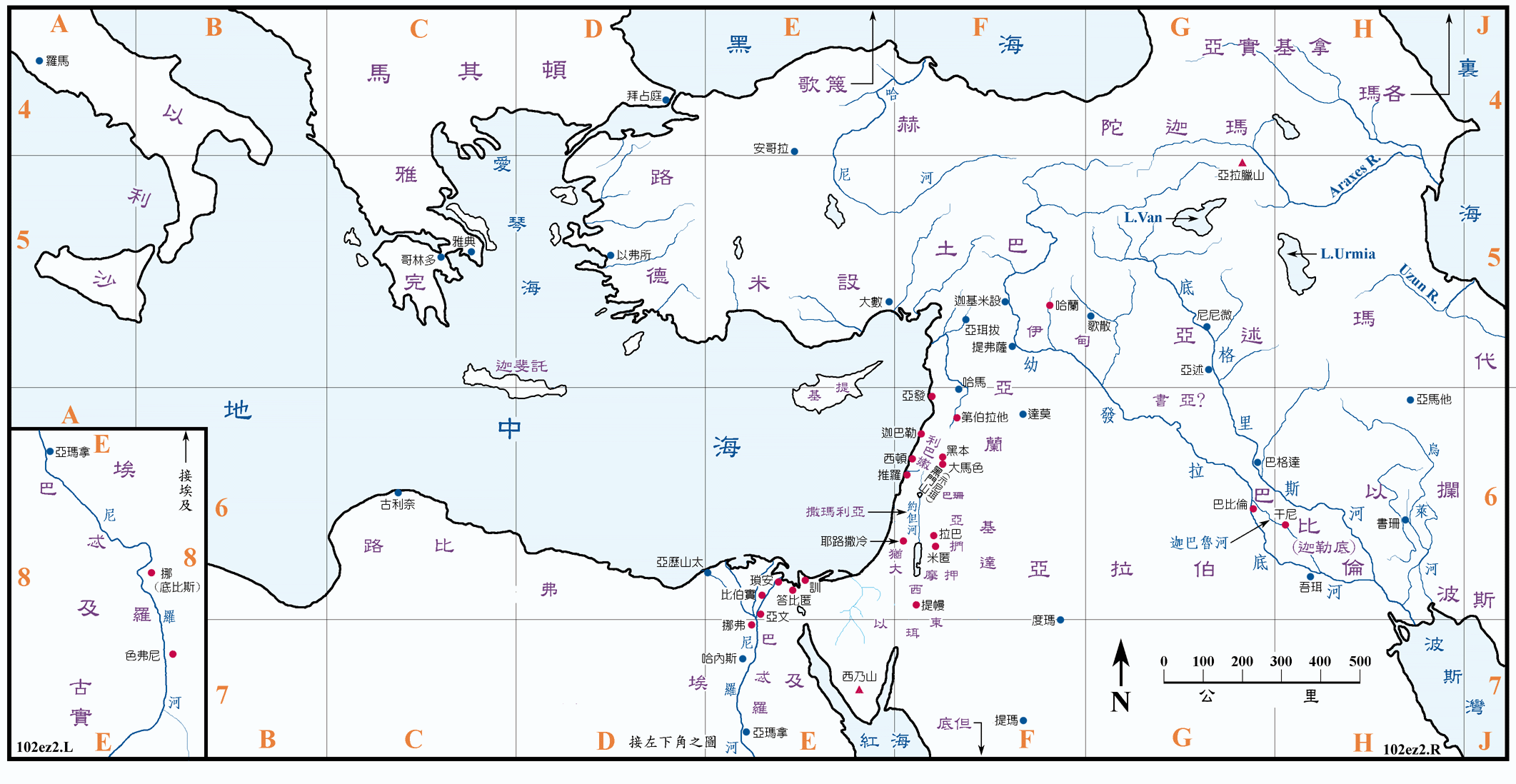 先知以西结所提到的范围甚广,包括过往的历史和他预言中将来的国家及城市,均一一绘在图中,请读者注意分辨。