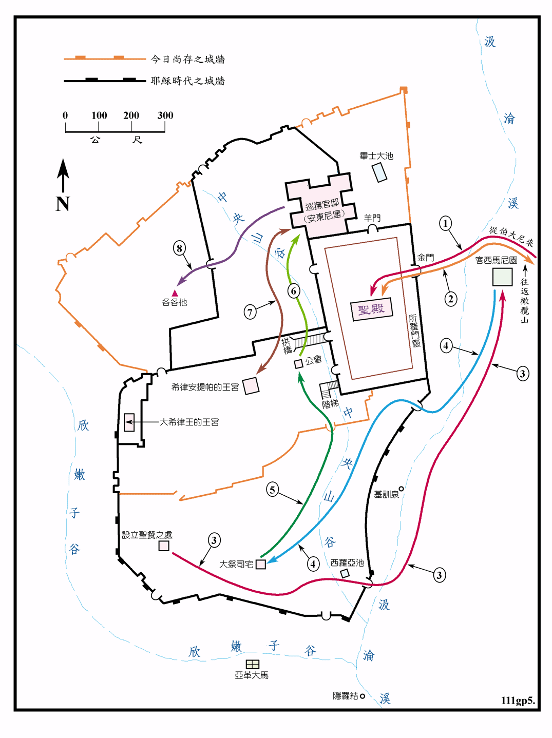 主耶稣设立圣餐和受审的大祭司住宅的确实位置都有争议,本图是按照传统的说法将其绘出,仅供参考。