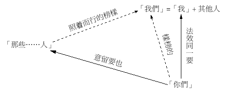 “留意”在原文与“顾”(二4)为同一个字(见该处注释);“留意”在此的目的不是为要提防(罗十六17),而是为要效法。294照这里的中文译法,腓立比人要留意的只是一班人,但原文表达的思想较为复杂,因为“照我们的榜样而行”原文直译为“照你们在我们身上所有的榜样而行”。因此全句其实包含了三个意思:(一)“你们也要留意那些人”;(二)“你们在我们身上有了榜样”;(三)“那些人是照我们的榜样行的”。295全节所表达的数种关系可用图表解释如下: