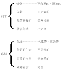新约可与主交通,旧约则不能。下文论及圣所与至圣所之间有幔子,非大祭司不能入至圣所,惟有我们新约的信徒,人人皆可朝见上主,与之深交。我们可将旧约之律例容纳于新约之中。旧约是刻在石版上的,新约是刻在信徒的心版上的,凡事皆由圣灵随时指导。可惜有等信徒泥守字句而不求其精意,此即所谓以词害意也。