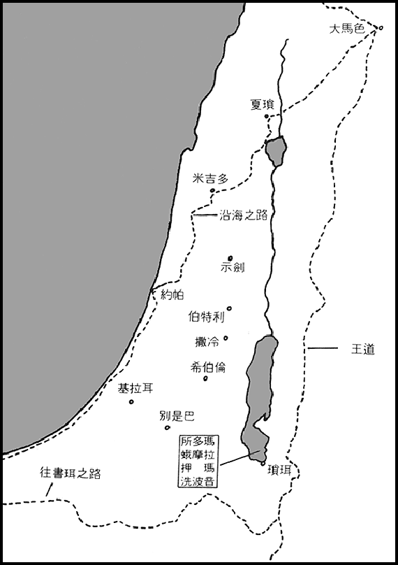 不幸的是到目前为止,远至以拦(波斯)和示拿(巴比伦)的大君王,没有一个确定的等于己知的统治者。但是把这纪录仔细分析,显示出他们并不是只来平息这地区五个小王的反叛,而是要镇压约但河外与犹大全区(参看下图)。这一场征伐,可能像十二年前那次,目的在于护通商航路,特别是‘皇道’南从大马色(在这里它连接较早提及的‘沿海之路’)至亚喀巴湾,继续前去南亚拉伯的示巴(故事中提名的地方);参看民数记二十章十七节至廿一章廿二节。帝王的军队认为已经‘扬威’够了,于是转回头来,经过南地,到达西订谷;依第三节所说,它是位在后来的死海。就在那里,在一场正规的阵地战役中打败了当地的军队。