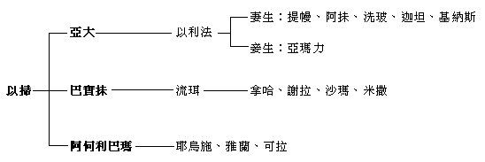 以扫众子的名字如下 以扫有三个妻子,五个儿子和十个孙子(有关数字问题,请参看五35的注释)记在本段。为方便明了起见,特表列如下(与代上一3537稍有不同):