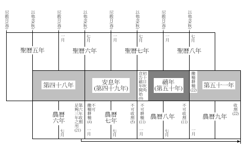 4.第七年 虽然没有说明是按以色列的那一种历法,但前节既然说第六年有耕种和收藏地的出产,应该是指农历,以收割作第六年的结束,而不是春天开始的圣历。