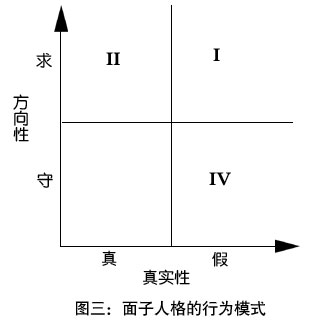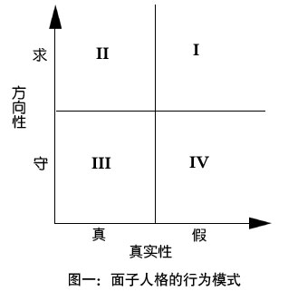 图一由两个向度组成。第一个(横)向度是真实性向度,说明一个人内心世界与外表言行的相符程度。如果表里间的差距愈短则愈真实,人格也愈正直;距离愈远则愈虚假,面子人格也愈突出。第二个(纵)向度是方向性向度,说明人在对待面子上所采取的主动和被动的态度,是积极地争面子,还是消极地保面子。这两个向度构成了四个象限。