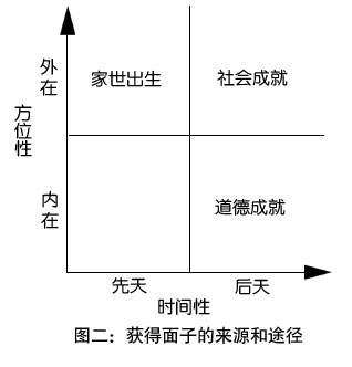 图二由两个向度组成。第一个(横)向度是时间性向度,说明人获得面子的途径是先天性的还是后天性的。第二个(纵)向度是方位性向度,说明人获得面子的领域是内在性的还是外在性的。这两个向度构成了四个象限。值得注意的是先天、内在象限的空缺。这是我们在下节将要着重探讨的。